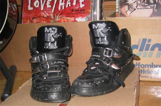 Superado el problema del aroma, e inspeccionando un poco la pinta de las zapatillas, la verdad es que molan bastante. Son negras, de bota como todas las zapatillas deberían ser (algún día hablaremos del declive del calzado deportivo en la última década, ya que es un tema que da para mucho), con tachuelitas incrustadas por todas partes y unas cuantas trabillas super jevis en la zona de los cordones y a los lados. La verdad es que, si no te fijas en la lengüeta y en el talón, ya que ahí está el logotipo de Michael Jackson, parecen unas botas super hardrockeras. A pesar de que mi colega Carlos mantenga que parecen botas de negra gorda con gorra morada de éstas que gesticulan mucho y dicen ‘perdona cariño, pero vas a tener que mover tu jodido culo blanco’, y que cuando salen en las series americanas todo el mundo se ríe. Una opinión que aún no se qué base y fundamento tiene. Él sabrá.